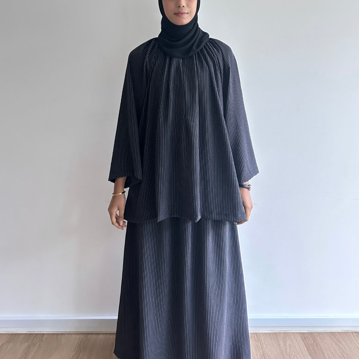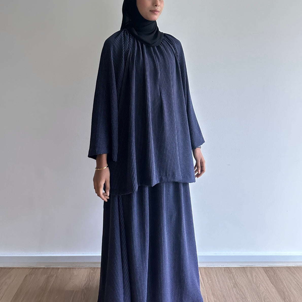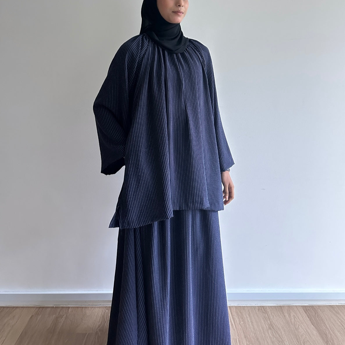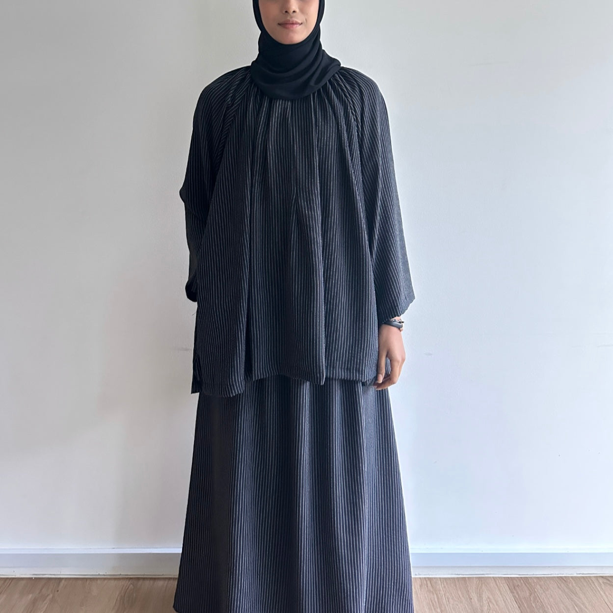 Lightweightcrinkle-textured fabric with a chic stripe print, this two-piece set blends elegance with comfort. The rubberised waist skirt ensures a flattering fit with effortless movement, while the top features a front quarter zipperfor ease and style. Designed with functional pockets on both the top and bottom, this set is as practical as it is graceful — making it a versatile choice for casual days or dressed-up occasions.