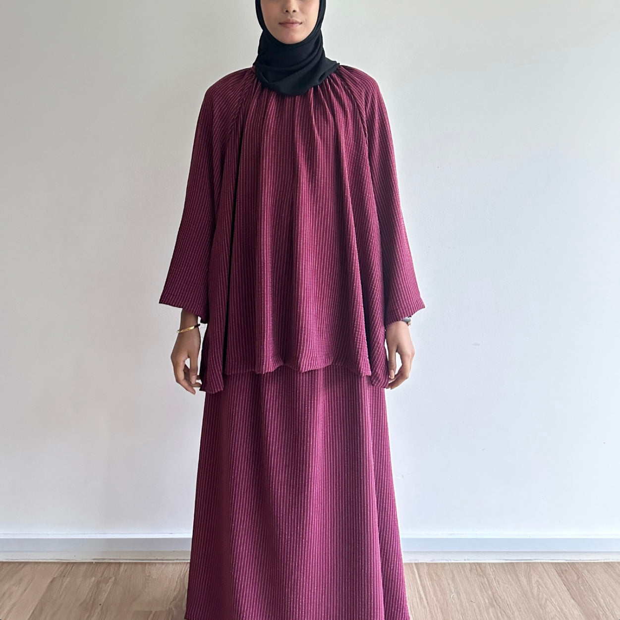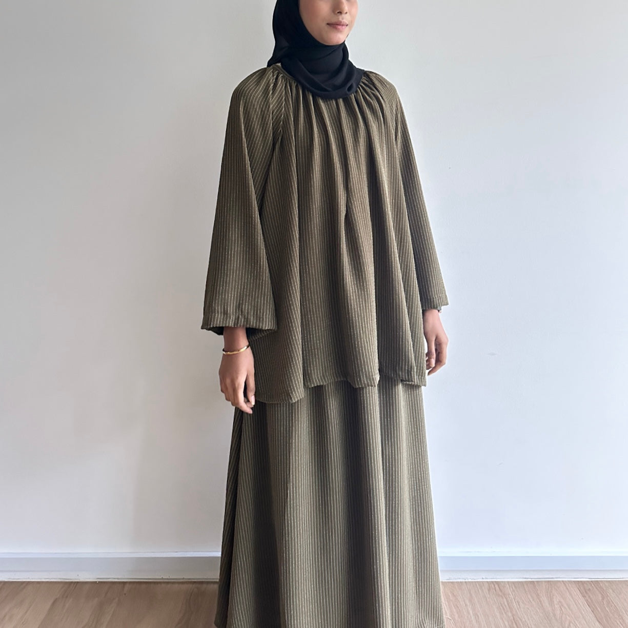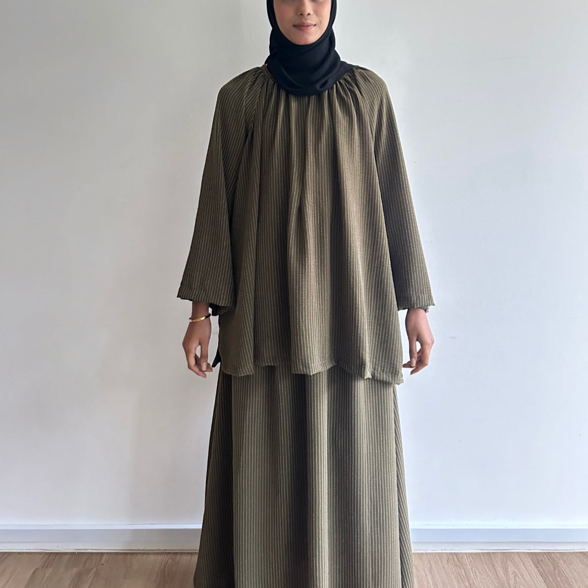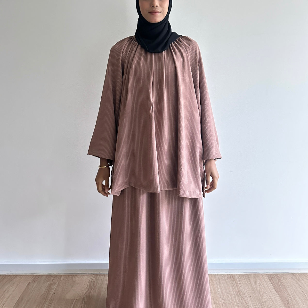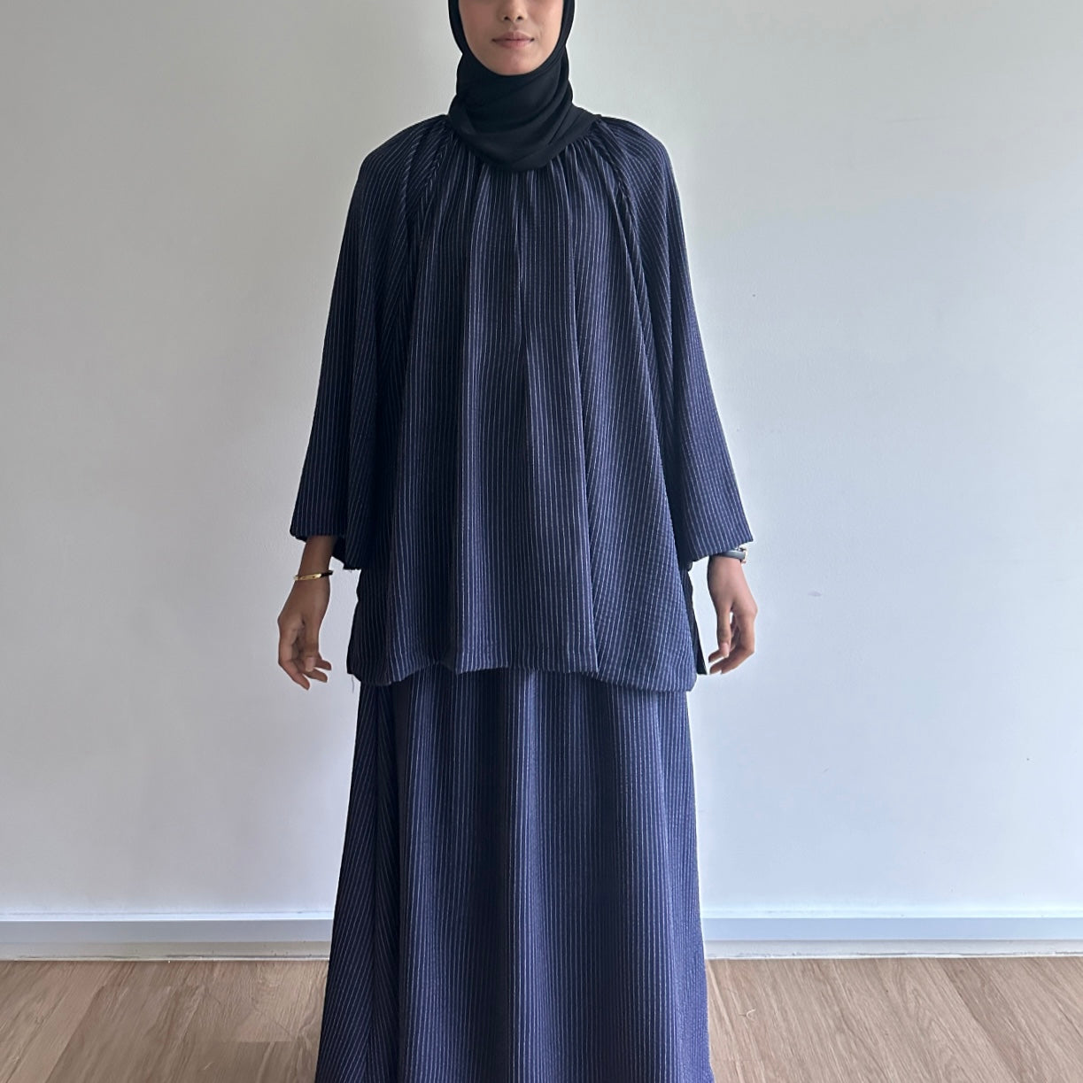 Lightweightcrinkle-textured fabric with a chic stripe print, this two-piece set blends elegance with comfort. The rubberised waist skirt ensures a flattering fit with effortless movement, while the top features a front quarter zipperfor ease and style. Designed with functional pockets on both the top and bottom, this set is as practical as it is graceful — making it a versatile choice for casual days or dressed-up occasions.