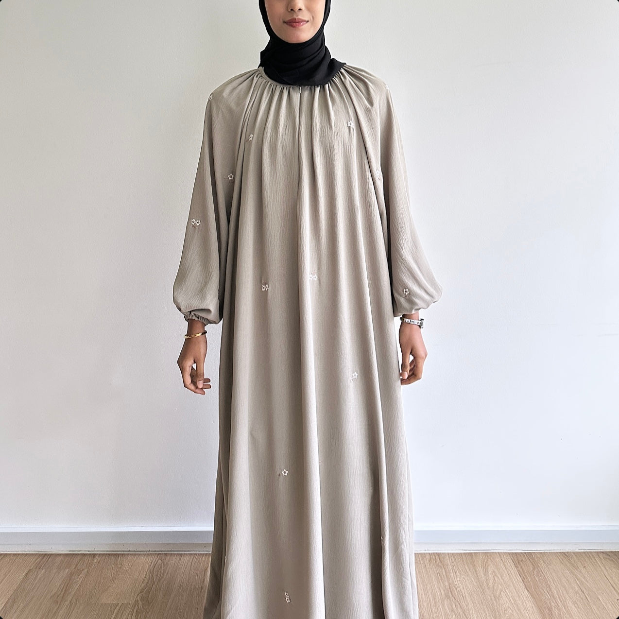 This dress features soft floral embroidery detailing and elegant puffy sleeves with elastic cuffs, designed in a relaxed, modest fit for all-day comfort.